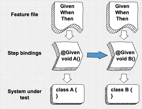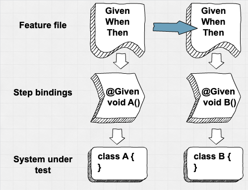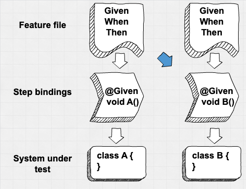 Once a team builds up a library of useful Given-When-Then steps, testers or analysts can often write new scenarios that require little or no developer involvement to automate. Scenarios with shared steps usually call the same step bindings. A step that’s worded the same, or very similarly, in two different scenarios will typically have a single implementation, as in the picture below: