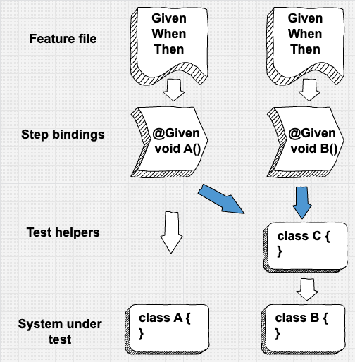 One of the best things about SpecFlow and similar tools is that they separate the system under test from the textual scenarios using a very thin layer of code. This layer should be thin, but it doesn’t have to be just one level deep.