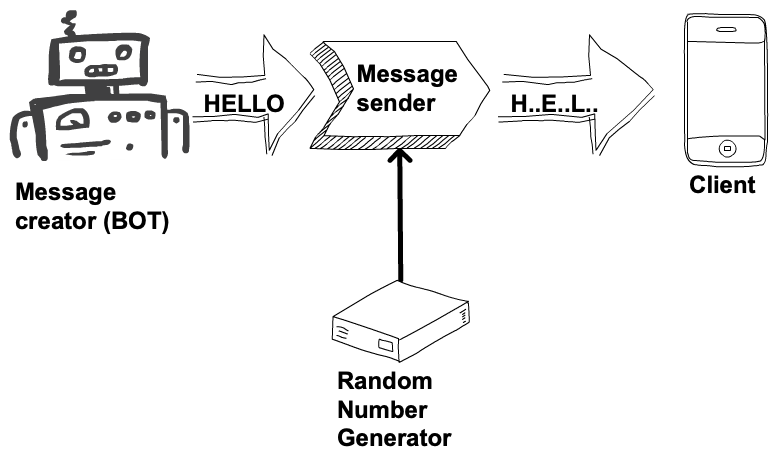 So, to answer the original challenge, let’s set strict scope. Do we want to actually prove the distribution of random numbers? Is the delay different for different types of messages? Or do we just want to prove that given some message the appropriate delays get inserted between letters? Let’s focus on on the message sender itself for this feature. The “bot” part is actually out of scope, as is the original message from a user. The random number generator is also out of scope.
